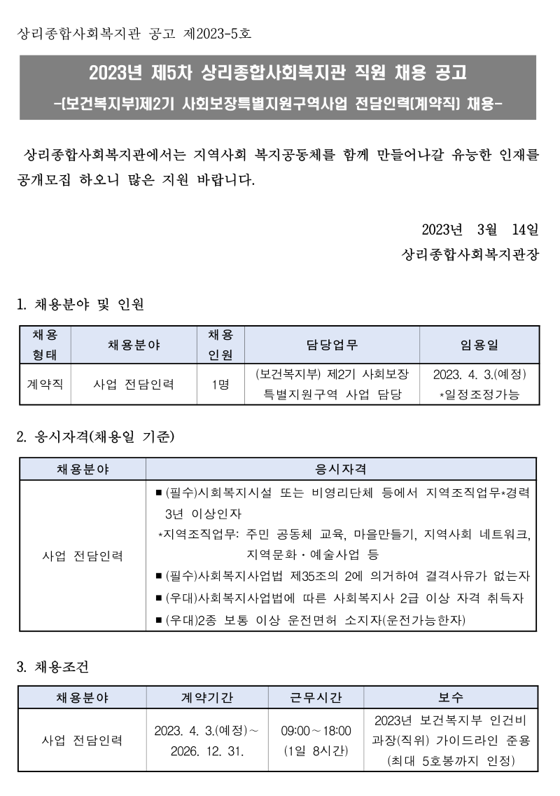 2023년 제5차 직원 채용 공고 - 보건복지부 제2기 사회보장특구사업 전담인력(계약직) 페이지 정보 작성자 관리자 작성일 23-03-14 14:46 본문 목록 답변 이전글2023년 제6차 직원 채용 공고 - 상리재가노인지원서비스센터 신입사회복지사(정규직) 23.03.14 다음글2023년 제3차 사회복지사(출산휴가대체인력) 채용 면접 최종 합격자 공지 23.03.06