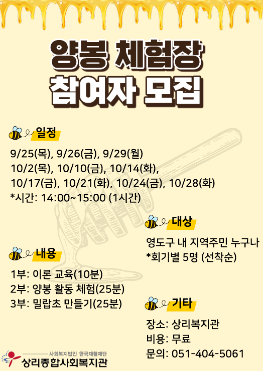 본 복지관에서는 영도구 내 지역주민을 대상으로 양봉 체험장을 운영하고 있습니다.