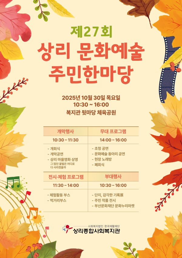 상리마을 주민들과 함께하는 『제27회 상리 문화예술 주민한마당』을 10월 30일(목)에 상리종합사회복지관에서 개최합니다!!
