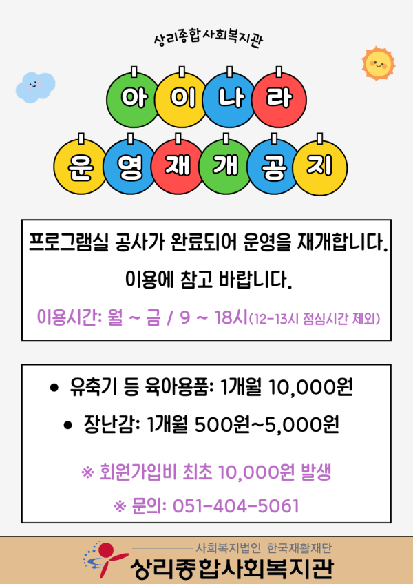 아이나라 프로그램실 운영 재개 안내 페이지 정보 작성자 강민지 작성일 26-03-27 17:21 본문 공사가 마무리되어, 아이나라 프로그램실 운영을 다시 시작합니다 ^^ ※ 이용시 가입 필요(최초 가입비 10,000원)※ 문의: 051-404-5061 목록 답변 다음글[언론보도] 청년 프로그램 지원 사업 연구대원 모집 26.03.24