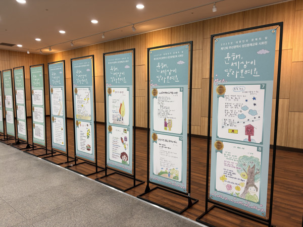 수업 시간에 배운 한글을 한 글자 한 글자 정성껏 담아낸 작품들이 전시되었습니다.