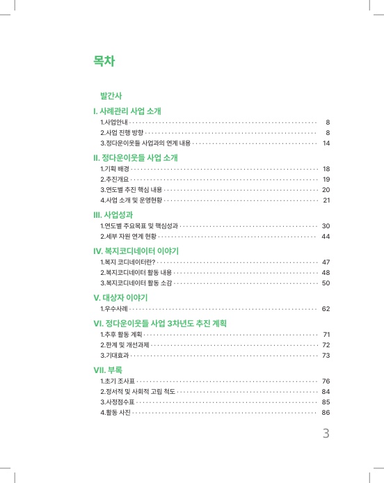 이 사례집에는 현장에서의 발굴 과정, 관계망 형성의 실제, 그리고 대상자와 복지코디네이터의 변화가 담겨 있습니다. 이는 단순한 사업 성과를 넘어 지역이 어떻게 사람을 품을 수 있는지에 대한 기록이자 실천의 결과물이라 할 수 있습니다.